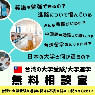 台湾の大学受験のイロハから、大学の選び方、必要な手続きやスケジュール、中国語の学習方法まで、気になっていることや悩んでいることなど、お気軽にご相談ください。
