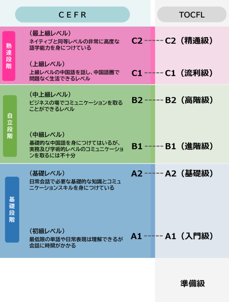 TOCFLも上記の基準にあわせ3つの受験レベルと6つの判定レベルからなっています※2。