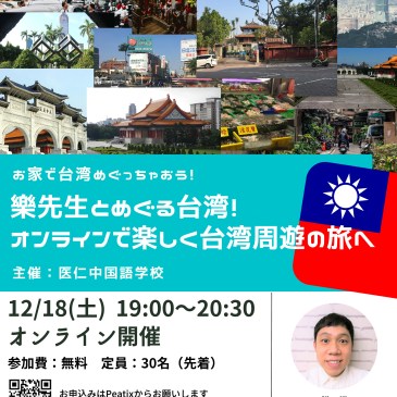 先日ご案内させていただいた「樂先生とめぐる台湾!オンラインで楽しく台湾周遊の旅へ 」のイベントチラシを作成いたしました。 まだまだお申込みは募集しております😊中国語不要!お財布不要!耳だけ参加OK!お気軽にお申し込みくだ … 続きを読む : イベントチラシつくりました(12月18日 樂先生とめぐる台湾!オンラインで楽しく台湾周遊の旅へ)